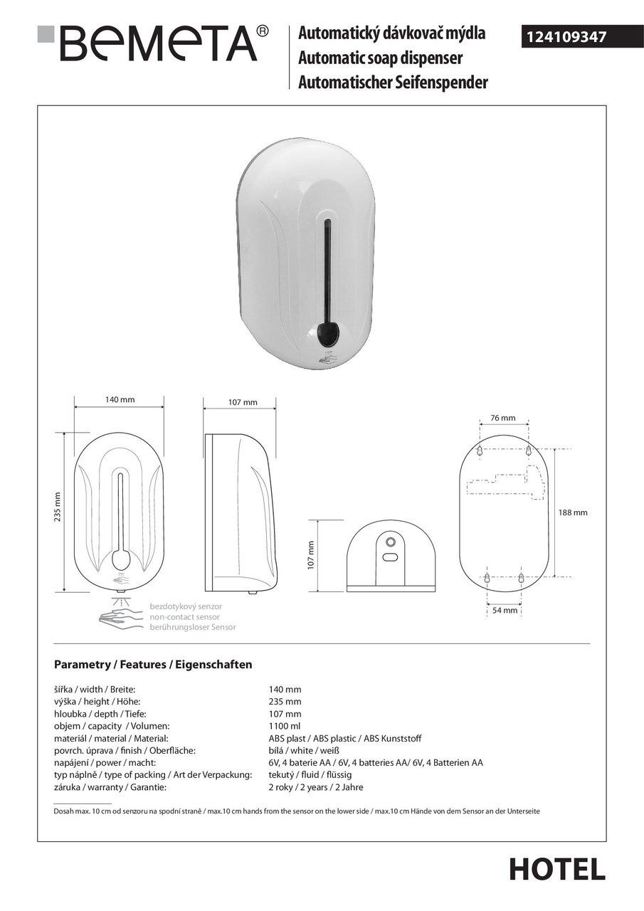 Дозатор для рідкого мила автоматичний Hotel (124109347), Bemeta