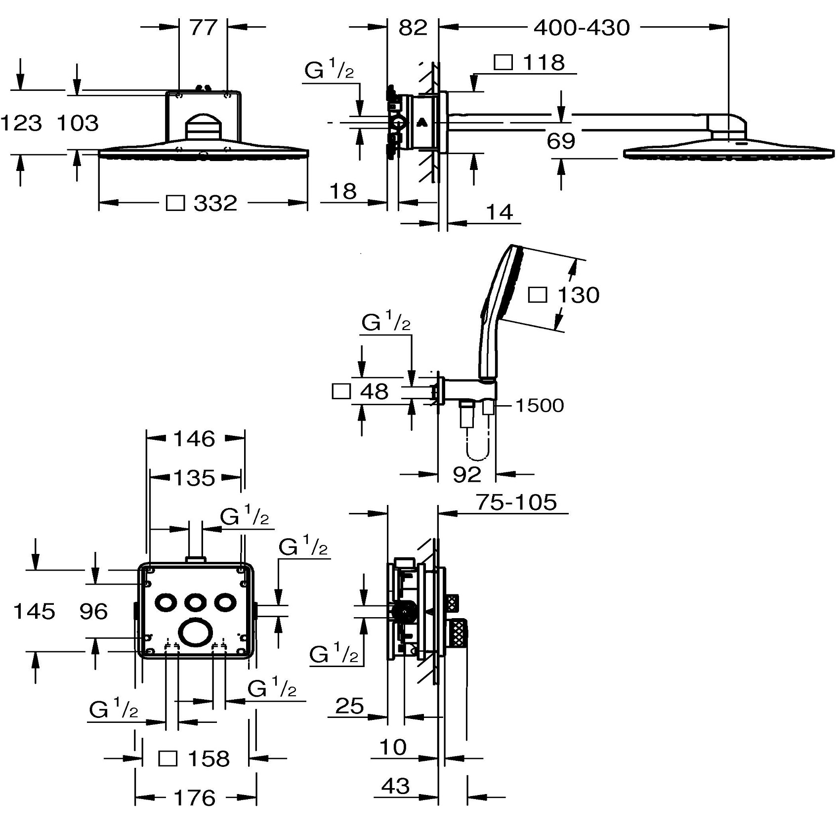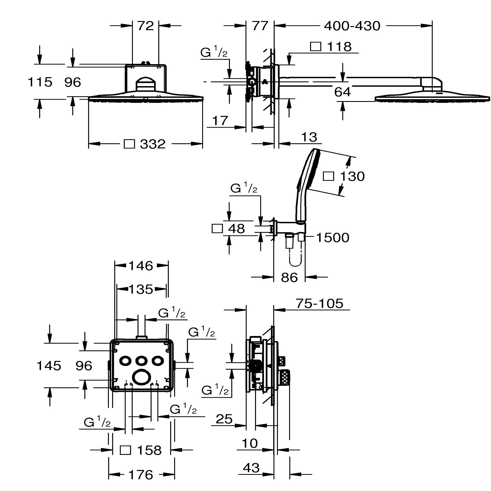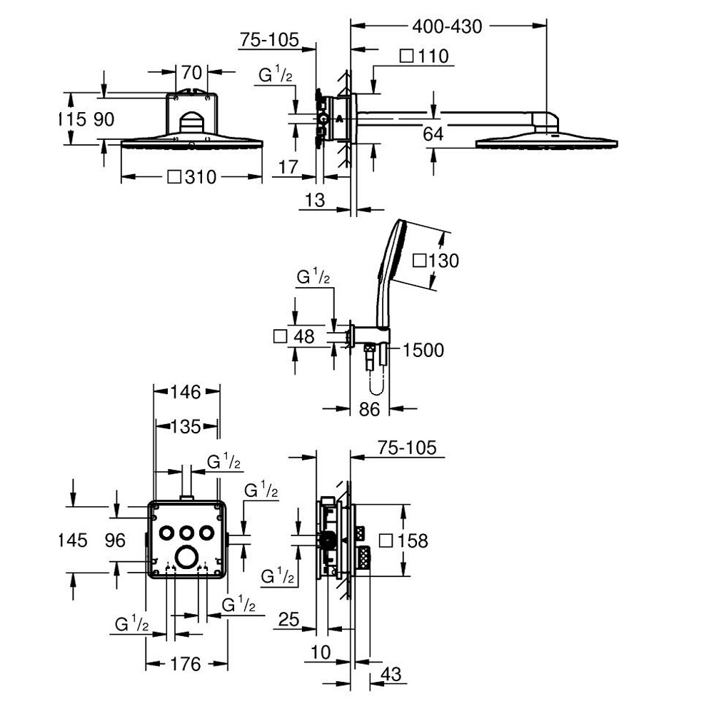 34864000 GRT SmartControl Душова система на 3 виходи, квадратна, 310 (1 сорт)
