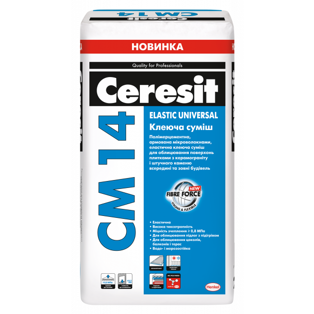 Полімерцементна, армована мікроволокнами клеюча суміш, для облицювання поверхонь плитками із керамограніту і штучного каменю всередині та зовні будівель Ceresit CM 14 УКРАЇНА