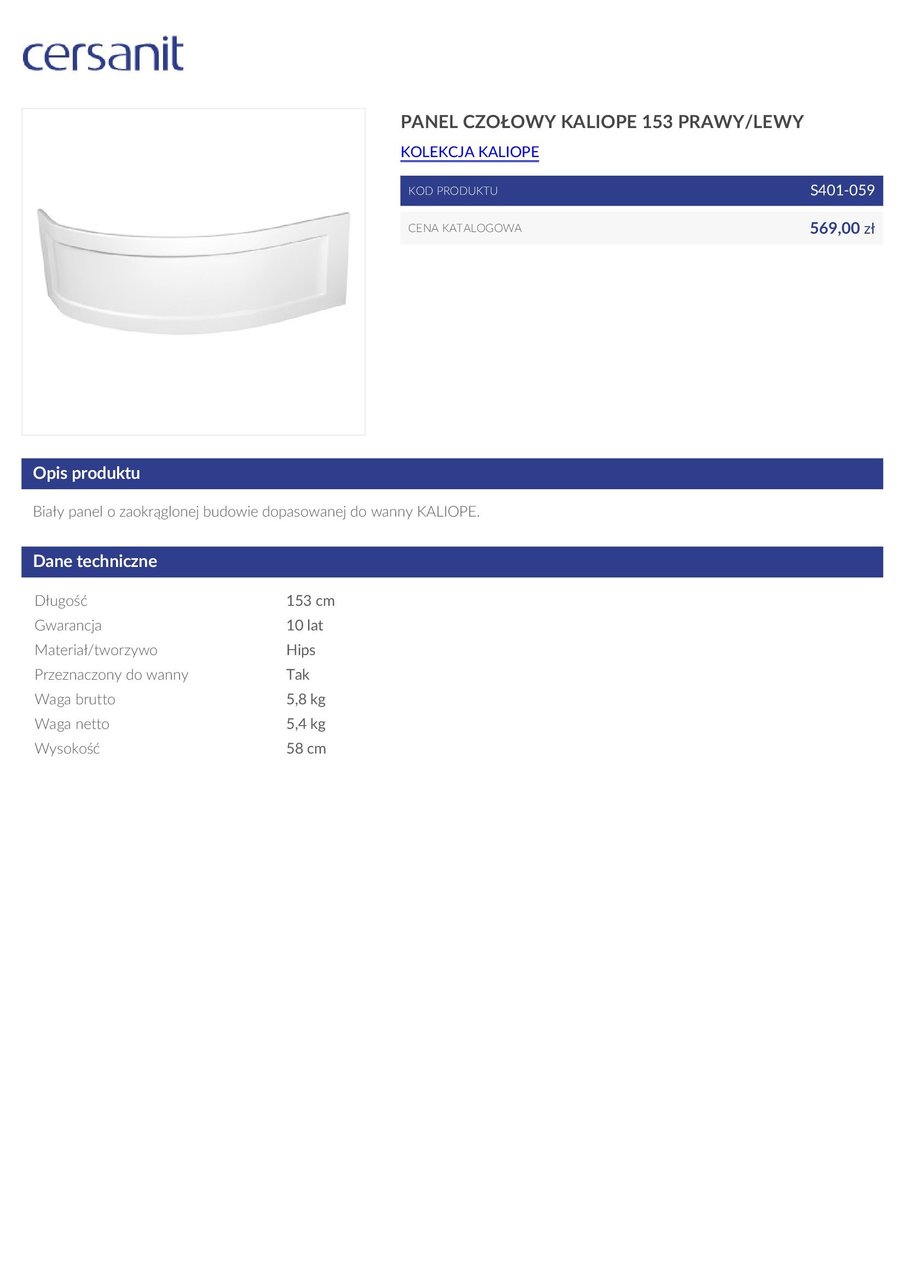 Панель для ванни універсальна Kaliope 153, Cersanit