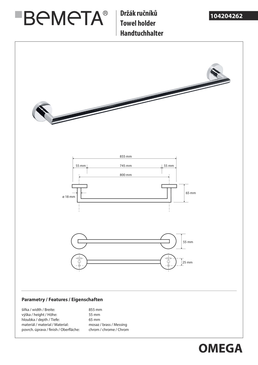 104204262 Omega Тримач рушника 80 см хром Bemeta