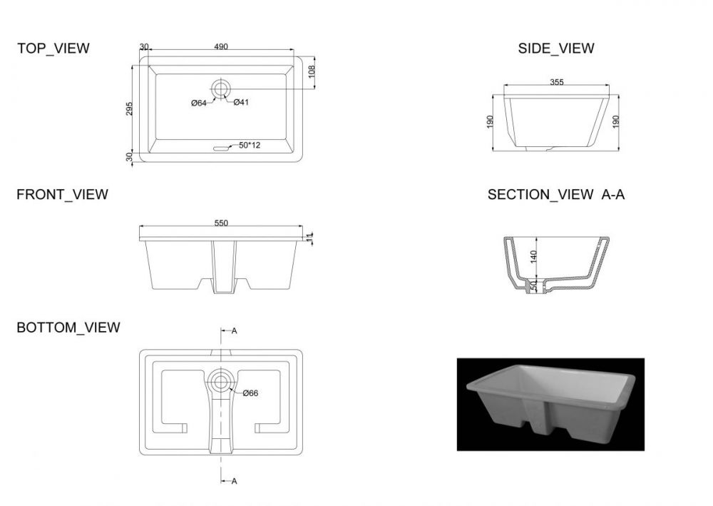 1611132 QUADRA Раковина під стільницю 550х355х190 (1 сорт)