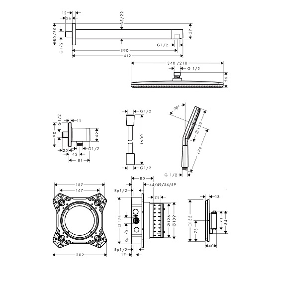 Комплектація: ручний душ, настінний тримач, верхній душ, тримач, термостат, підключення для душового шлангу, душовий шланг