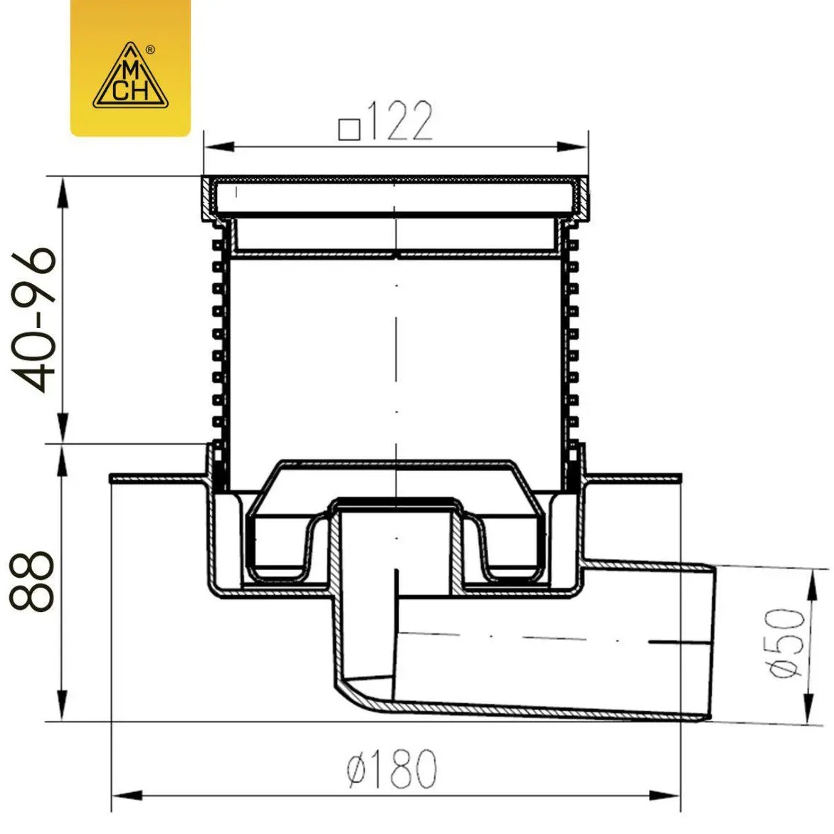 C 425 XL Двокорпусний трап з горизонтальним підключенням DN50, h 113-169мм, сухий сифон Neptun, з фланцем, решітка під плитку з нержавіючої сталі (1 сорт)